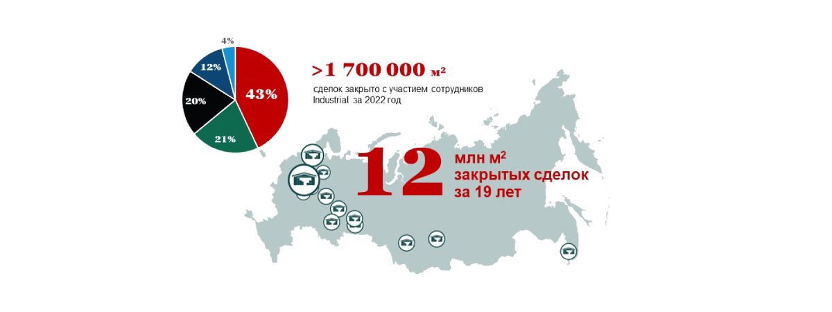 ∙ Самая большая команда на рынке (20 человек) ∙ Самая опытная команда (14 лет - средний опыт) ∙ Занимаем 43% доли рынка складской недвижимости среди топ-5 крупнейших компаний рынка ∙ Общая реализованная площадь в России по итогам 2020 года – 1 185 000 м² ∙ Представляем интересы всех участников рынка ∙ Оказываем юридическое сопровождение, обеспечиваем комфортные условия сотрудничества